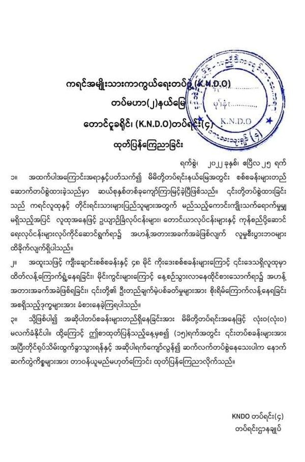 တောင်ငူခရိုင် တပ်ရင်း(၄)နယ်မြေအတွင်း တပ်စွဲထားသော တပ်မတော်စစ်ခန်းများ ရုပ်သိမ်းထွက်ခွာရန် KNDO တောင်းဆို
