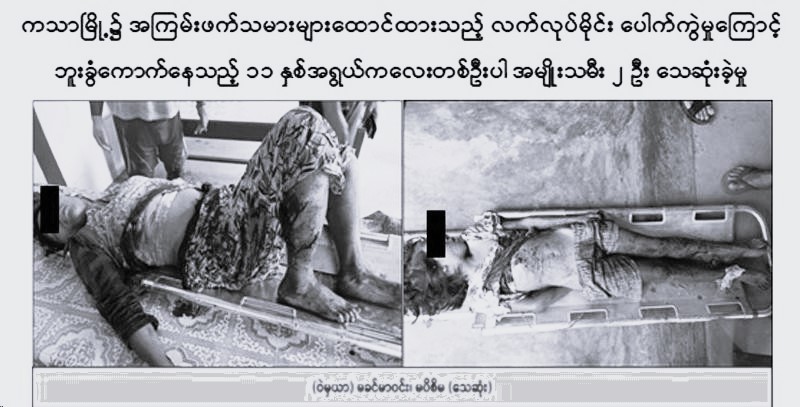 ထို႔အတူ မိခင္ျဖစ္သူ မခင္မာဝင္းမွာ ေနာက္ေက်ာ၊ ေျခသလုံးႏွင့္ လက္ဖ်ံတို႔တြင္ မိုင္းစထိမွန္ဒဏ္ရာ (၉)ခ်က္ရရွိခဲ့ ၍ ကသာၿမိဳ႕ျပည္သူ႔ေဆး႐ုံတြင္ ေဆးကုသမႈခံယူေနစဥ္ ဒဏ္ရာမ်ားေၾကာင့္ ထပ္မံေသဆုံးခဲ့ေၾကာင္း ရဲတပ္ဖြဲ႕မွ ထုတ္ျပန္ထားသည္။