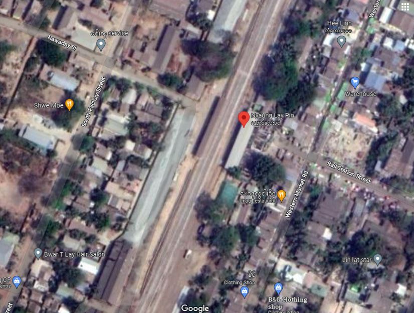 The station is located in Myoma 3 Ward in Nyaunglebin Township, Bago Region. The bomb went off between the railroad and the station platform.