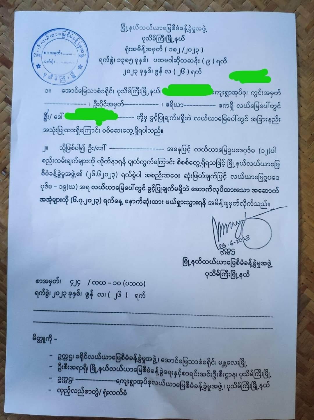 ၿပီးခဲ့သည့္ ဇြန္လ ၂၇ ရက္က မႏၲေလးၿမိဳ႕၊ ပုသိမ္ႀကီးၿမိဳ႕နယ္အတြင္းရွိ နန္းဦးလြင္၊ မဲခင္းကုန္း၊ ေဂြ႕ႀကီးကုန္း၊ ကန္ေကာက္အေရွ႕ စသည့္ေက်း႐ြာမ်ားရွိ ေနအိမ္အေဆာက္အဦးမ်ား ရာႏွင့္ခ်ီ ဖယ္ရွားေပးရန္ ထုတ္ျပန္စာလာေရာက္ကပ္သြားခဲ့ျခင္း ျဖစ္သည္။