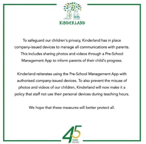စင္ကာပူႏိုင္ငံရဲ႕ မူႀကိဳေက်ာင္းစင္တာ Kinderland ဟာ အလုပ္ခ်ိန္အတြင္း ကေလးေတြရဲ႕လုံၿခဳံေရးအတြက္ ဝန္ထမ္းေတြကို တစ္ကိုယ္ေရသုံး စက္ပစၥည္းေတြ အသုံးျပဳျခင္းမွ တားျမစ္သြားမယ္လို႔ ေၾကာညာထားပါတယ္။