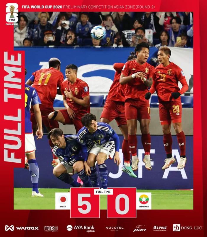 မြန်မာ့လက်ရွေးစင်အသင်းအနေဖြင့် အင်အားကြီးဂျပန်အသင်းအား ခံစစ်အသားပေး ယှဉ်ပြိုင်ခဲ့သော်လည်း Ueda၊ Kamada နှင့် Doan ၏ သွင်းဂိုးများ၊ကို ခွင့်ပြုပေးခဲ့ရပြီး ၅ ဂိုး-ဂိုးမရှိဖြင့် ရှုံးနိမ့်ခဲ့သည်။