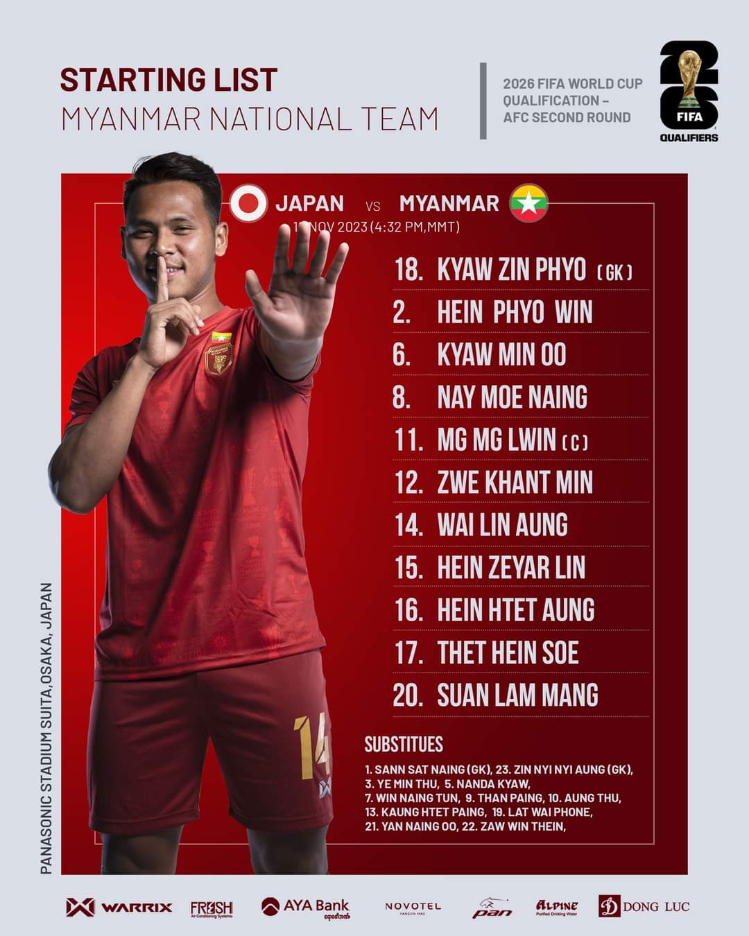 ယေန႔(ႏိုဝင္ဘာ ၁၆ ရက္)၊ ညေန ၄ နာရီ ၃ဝ မိနစ္အခ်ိန္တြင္ ဂ်ပန္ႏိုင္ငံ၊ အိုဆာကာၿမိဳ႕ရွိ PANASONIC STADIUM SUITA တြင္ ဂ်ပန္အသင္း ႏွင့္ ျမန္မာအသင္းတို႔ ယွဥ္ၿပိဳင္ကစားခဲ့ျခင္းျဖစ္သည္။