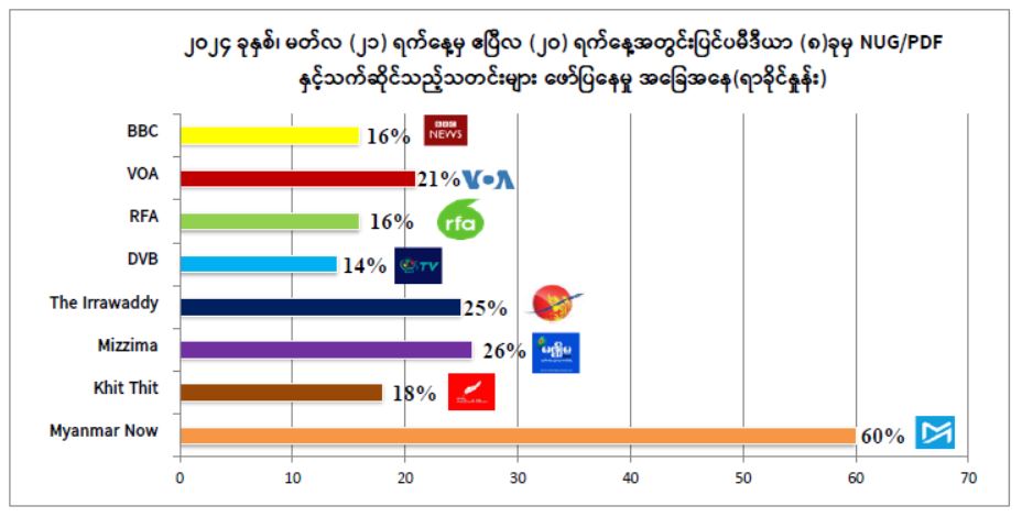 တယ်လို့ ပြဆိုထားတဲ့ သတင်းအချက်အလက်ကတော့ (၁၆) ရာခိုင်နှုန်းသော သတင်းပုဒ်ရေပါပဲ။ ရက်ပေါင်း(၃၀)အတွင်း သတင်းပုဒ်ရေ(၂၆၃)ပုဒ်ထဲကနေ (၁၆)ရာ ခိုင်နှုန်းဟာ NUG -PDF ကို ထောက်ခံရေးသားထားတာဖြစ်ပြီး တခြားတစ်ဖက်မှာတော့ စစ်တပ်ကို သွယ်ဝိုက်၍ဖြစ်စေ၊ တိုက်ရိုက်ဖြစ်စေ အပြစ်ရှာရေးသားမှုဟာ(၂၀)ရာခိုင်နှုန်းအထက်မှာ ရှိနေပြန်ပါတယ်။ ရက်ပေါင်း(၃၀)အတွင်း လူတွေကြားမှာ သို့လောသို့လော အဖြစ်စေဆုံး BBC ရဲ့သတင်း အဆိပ်ဟာ ဒုတိယဗိုလ်ချုပ်မှူးကြီး စိုးဝင်းရဲ့သတင်းပါပဲ။