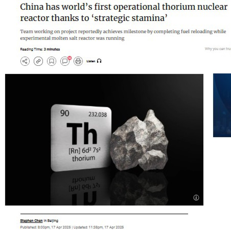 တ႐ုတ္ႏိုင္ငံသိပၸံပညာရွင္မ်ားဟာ သိုရီယမ္အရည္ကို အေျခခံတဲ့ န်ဴကလီးယားဓာတ္ေပါင္းဖို လည္ပတ္ေနစဥ္ ေလာင္စာအသစ္ကို ေအာင္ျမင္စြာ ထည့္သြင္းႏိုင္ခဲ့ေၾကာင္း ႏိုင္ငံပိုင္မီဒီယာမ်ားက ေဖာ္ျပခဲ့ပါတယ္။ ဒီျဖစ္ရပ္ဟာ သန႔္ရွင္းတဲ့ စြမ္းအင္နည္းပညာမွာ မွတ္တိုင္တစ္ခုျဖစ္လာပါတယ္။ ယူေရနီယမ္ထက္ ပိုမိုေဘးကင္းၿပီး ပမာဏပိုမိုႂကြယ္ဝစြာေတြ႕ရွိရတဲ့ သိုရီယမ္ကို အသုံးျပဳေရး ႏိုင္ငံတကာယွဥ္ၿပိဳင္ပြဲမွာ တ႐ုတ္ႏိုင္ငံကို ေရွ႕တန္းသို႔တြန္းပို႔လိုက္ျခင္းပဲျဖစ္တယ္လို႔ “ေဆာက္သ္ခ်ိဳင္းနားေမာနင္းပို႔စ္” က ဧၿပီလ ၁၇ ရက္မွာ ေရးသားပါတယ္။