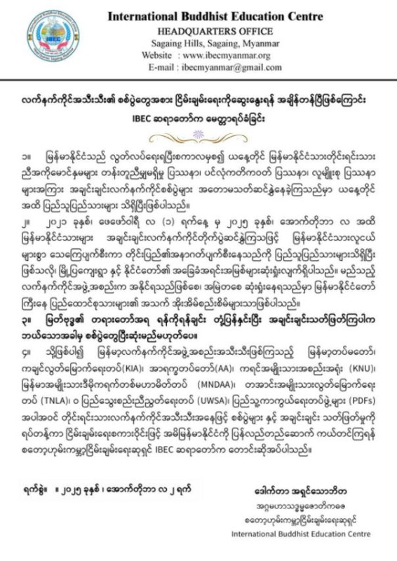 ျမတ္ဗုဒၶ၏ တရားေတာ္အရ ရန္ကိုရန္ခ်င္း တုံ႔ျပန္ႏွင္းၿပီး အခ်င္းခ်င္းသတ္ျဖတ္ၾကပါက ဘယ္ေသာအခါမွ စစ္ပြဲမ်ား ၿပီးဆုံးမည္ မဟုတ္ေၾကာင္း၊ ထို႔ေၾကာင့္ ျမန္မာ့လက္နက္ကိုင္အဖြဲ႕အစည္းအသီးသီး အေနျဖင့္ စစ္ပြဲမ်ား ႏွင့္ အခ်င္းခ်င္းသတ္ျဖတ္မႈကို ရပ္တန႔္ကာ ၿငိမ္းခ်မ္းေရးစကားဝိုင္းျဖင့္ အမိျမန္မာႏိုင္ငံကို ျပန္လည္တည္ေဆာက္ ကယ္တင္ၾကရန္ စေတာ့ဟုမ္းကမာၻ႔ၿငိမ္းခ်မ္းေရးဆုရွင္ IBEC ဆရာေတာ္က ေတာင္းဆိုေၾကာင္း ေရးသားထားသည္။