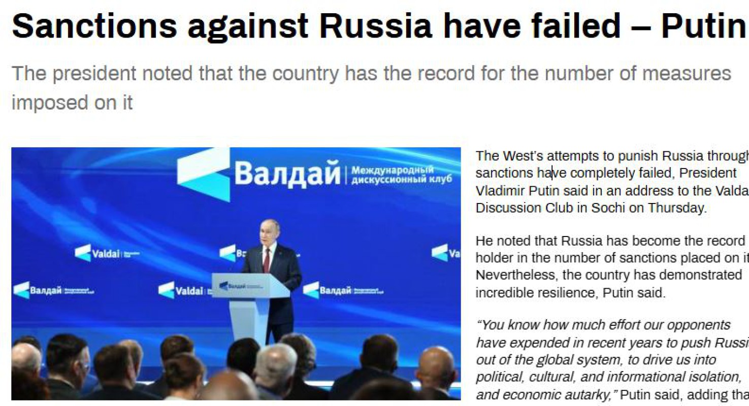 ရုရှားသမ္မတပူတင်သည် အောက်တိုဘာ ၂ ရက်က ဆိုချီမြို့တွင် ကျင်းပခဲ့သော Valdai Discussion Club အစည်းအဝေးအတွင်း မိန့်ခွန်းပြောဆိုချိန်တွင် ယင်းကဲ့သို့ ထုတ်ဖော်ပြောဆိုခဲ့ခြင်းဖြစ်သည်။ ရုရှားနိုင်ငံသည် လက်ရှိအချိန်တွင် စံချိန်တင် ပစ်မှတ်ထားပိတ်ဆို့မှုများကို ရင်ဆိုင်ခဲ့ရသော်လည်း တောင်ခံနိုင်စွမ်းရှိခဲ့ကြောင်း ရုရှားသမ္မတပူတင်က ပြောသည်။