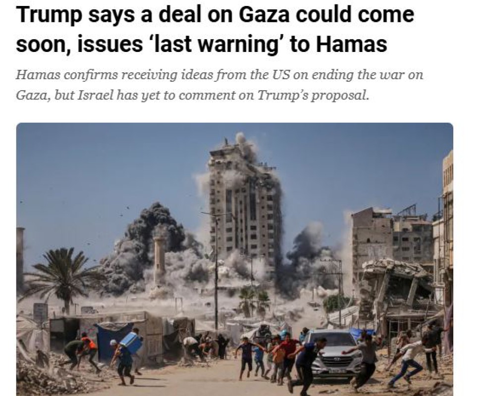 ဂါဇာကမ္းေျမာင္ေဒသတြင္ ျဖစ္ပြားေနသည့္စစ္ပြဲကို အဆုံးသတ္သြားေစမည့္ အေမရိကန္သမၼတေဒၚနယ္ထရမ့္၏ အစီအစဥ္ကို လက္ခံရန္ သင့္/မသင့္ ဟားမတ္စ္လက္နက္ကိုင္အဖြဲ႕က စဥ္းစားေနသည့္အခ်ိန္တြင္ အစၥေရးအစိုးရ၏ ေနာက္ဆုံးသတိေပးခ်က္မ်ားထြက္ေပၚလာျခင္းျဖစ္သည္။