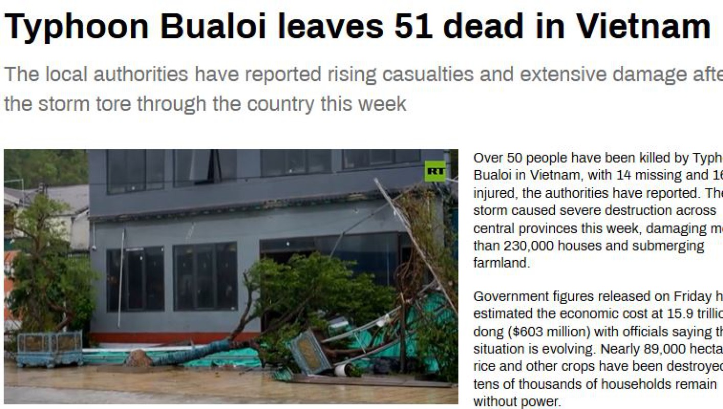 ဗီယက်နမ်နိုင်ငံမှာ တိုင်ဖွန်းမုန်တိုင်း Bualoi ဝင်ရောက်တိုက်ခတ်မှုကြောင့် လူ(၅ဝ)ကျော် သေဆုံးခဲ့ပြီး လူ(၁၄)ဦး ပျောက်ဆုံးနေကာ အခြားလူ(၁၆၄)ဦး ထိခိုက်ဒဏ်ရာရရှိခဲ့တယ်လို့ အာဏာပိုင်တွေက ထုတ်ပြန်ပြောကြားခဲ့ပါတယ်။ တိုင်ဖွန်းမုန်တိုင်း Bualoi ကြောင့် ဗီယက်နမ်နိုင်ငံ အလယ်ပိုင်းပြည်နယ်တွေမှာ ပျက်စီးမှုအများအပြား ဖြစ်ပေါ်ခဲ့ပြီး နေအိမ်ပေါင်း(၂၃၀၀၀၀)ကျော် နဲ့ လယ်မြေတွေ ရေနစ်မြုပ်ပျက်စီးခဲ့တယ်လို့ သိရပါတယ်။