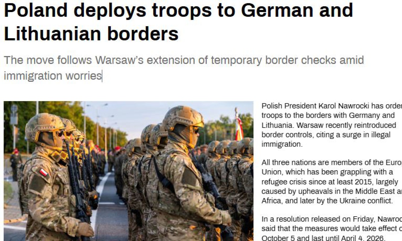 ဂ်ာမနီႏိုင္ငံ၊လစ္သူေယးနီးယားႏိုင္ငံတို႔နဲ႔ထိစပ္ေနတဲ့နယ္စပ္ေတြမွာ တပ္ဖြဲ႕ဝင္ေတြျဖန႔္က်က္ခ်ထားဖို႔ ပိုလန္ သမၼတ ကာ႐ိုးေနာ္ေရာ္ကီက အမိန႔္ေပးခဲ့တယ္လို႔ သိရပါတယ္။ တရားမဝင္ ဝင္ေရာက္လာမႈေတြ ျမင့္တက္ လာမႈ အေပၚကိုးကားၿပီး နယ္စပ္ထိန္းခ်ဳပ္မႈေတြကို ျပန္လည္စတင္ဖို႔ ပိုလန္အစိုးရက မၾကာေသးခင္က ဆုံးျဖတ္ခဲ့ တယ္လို႔လည္း သိရပါတယ္။