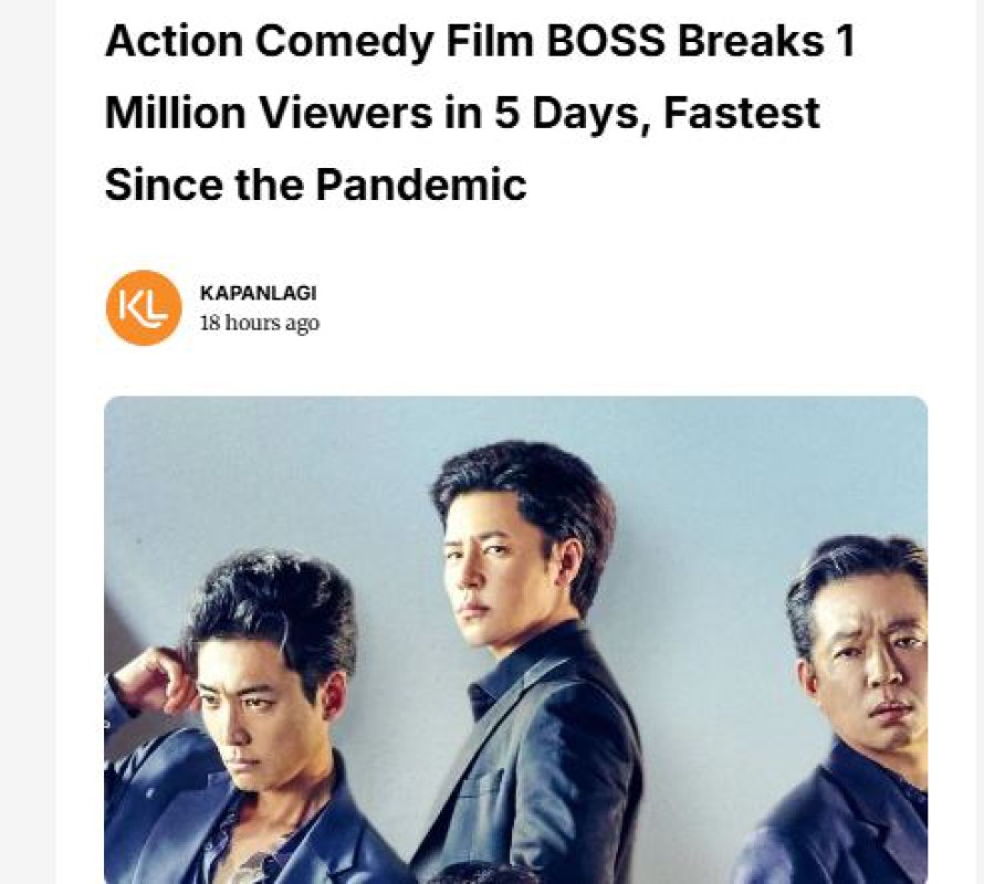 တောင်ကိုရီးယား ရုပ်ရှင်သစ် "Boss" ဟာ ထွက်ရှိပြီး ၄ ရက်အတွင်း Box Office မှာရုပ်ရှင်ကြည့်ရှုသူ ၁ သန်းကျော်ထိ ရရှိခဲ့တယ်လို့ သိရပါတယ်