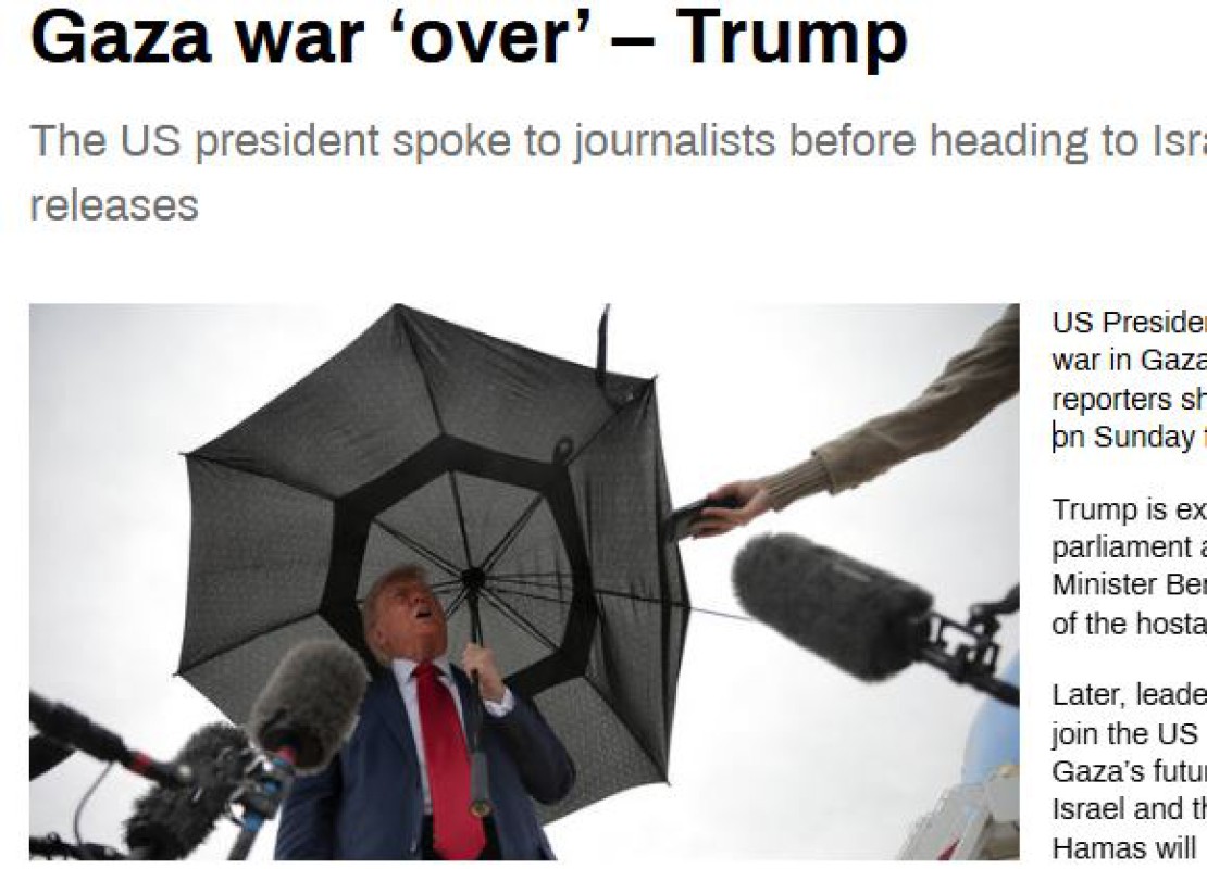 ဂါဇာစစ္ပြဲက ၿပီးဆုံးသြားၿပီလို႔ အေမရိကန္သမၼတေဒၚနယ္ထရမ့္က တရားဝင္ထုတ္ျပန္ေၾကညာခဲ့ပါတယ္။ ေဒၚနယ္ထရမ့္ဟာ အစၥေရးႏိုင္ငံကို သြားေရာက္ဖို႔အတြက္ ေလယာဥ္ေပၚမတက္ခင္ ယခုလိုထုတ္ျပန္ေၾကညာခဲ့ တာျဖစ္တယ္လို႔လည္း သိရပါတယ္။