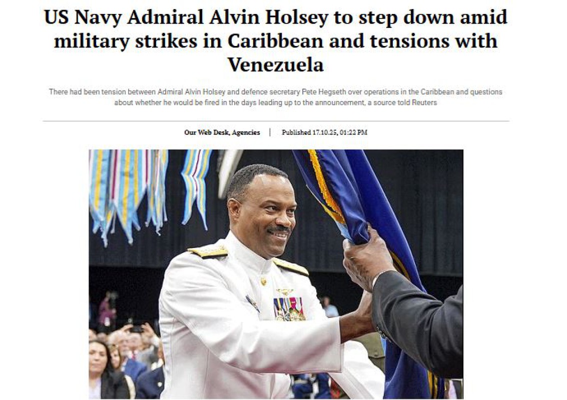 အမေရိကန်ရေတပ်ဗိုလ်ချုပ်ကြီး အယ်ဗင်ဟိုဆေးသည် အမေရိကန်နှင့် ဗင်နီဇွဲလားနိုင်ငံကြား တင်းမှုများ ရှိနေချိန် တွင် ရာထူးမှရုတ်တရက်နုတ်ထွက်သွားခဲ့ကြောင်း သိရသည်။ ကာရေဘီယံဒေသတွင်ပြုလုပ်သော အမေရိကန်နိုင်ငံ၏ စစ်ဆင်ရေးနှင့်ပတ်သက်ပြီး အမေရိကန်ကာကွယ်ရေးဝန်ကြီးဟတ်ဆီ နှင့် ဗိုလ်ချုပ် ဟိုဆေးကြားတင်းမာမှုများရှိနေချိန်တွင် ဟိုဆေးက ရာထူးမှနုတ်ထွက်ကြောင်း သိရသည်။ အမေရိကန်ရေတပ်သည် ပြီးခဲ့သည့်ရက်ပိုင်းတွင် ကာရေဗီယံဒေသအတွင်း မူးယစ်ဆေးဝါးတင်ဆောင်သည်ဟု သံသယရှိသည့်သင်္ဘောများကို ပစ်မှတ်ထားကာတိုက်ခိုက်ခဲ့ပြီး အောက်တိုဘာ ၁၇ ရက်ကလည်း ထပ်မံ ပစ်ခတ် တိုက်ခိုက်ခဲ့ကြောင်း သိရသည်။