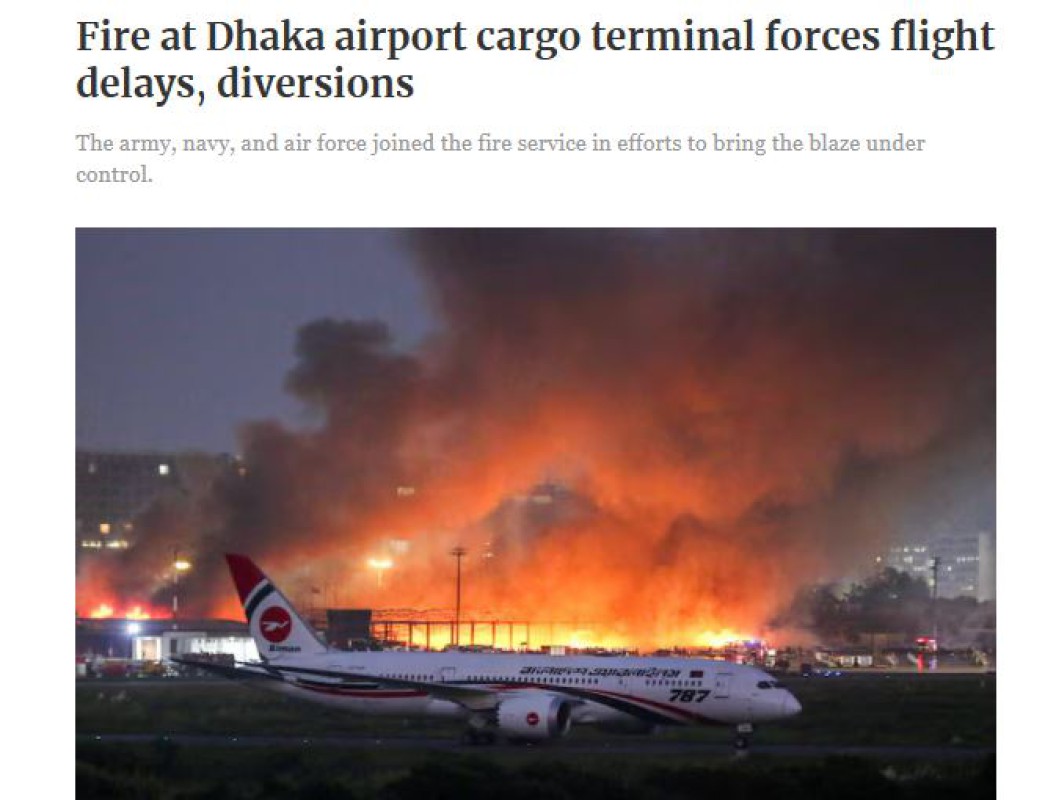 ဘဂၤလားေဒ့ရွ္ႏိုင္ငံ ဒါကာၿမိဳ႕က ေလဆိပ္တစ္ခုရဲ႕ ကုန္တင္ကုန္ခ်ေနရာမွာ ႀကီးမားတဲ့ မီးေလာင္ကြၽမ္းမႈေတြ ျဖစ္ပြားခဲ့တာေၾကာင့္ ေလယာဥ္ခရီးစဥ္ေတြ ေႏွာင့္ေႏွးတာမ်ိဳး ဒါမွမဟုတ္ ရပ္ဆိုင္းခဲ့ရတာမ်ိဳးရွိတယ္လို႔ တာဝန္ရွိသူေတြက ထုတ္ျပန္ေျပာၾကားခဲ့ပါတယ္။