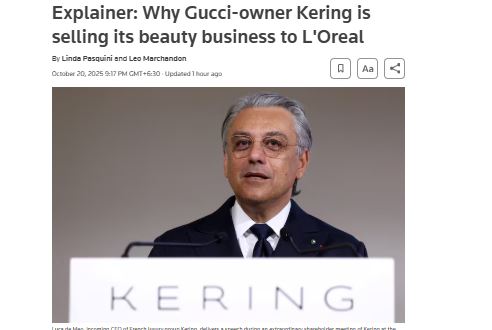 ကမ္ဘာကျော် ဇိမ်ခံဖက်ရှင် brand "Gucci" ပိုင်ရှင် ကဲရင်းက မြင့်မားလာနေတဲ့ကြွေးမြီတွေကို ကိုင်တွယ် ဖြေရှင်းဖို့ အလှကုန် brand "L'Oreal" ကို ယူရို ၄ ဘီလီယံနဲ့ရောင်းချဖို့ သဘောတူညီခဲ့တယ်လို့ အမှုဆောင်ချုပ် အသစ် လူကာဒီမီအိုက အောက်တိုဘာ ၁၉ ရက်မှာ ပြောကြားခဲ့ပါတယ်။
