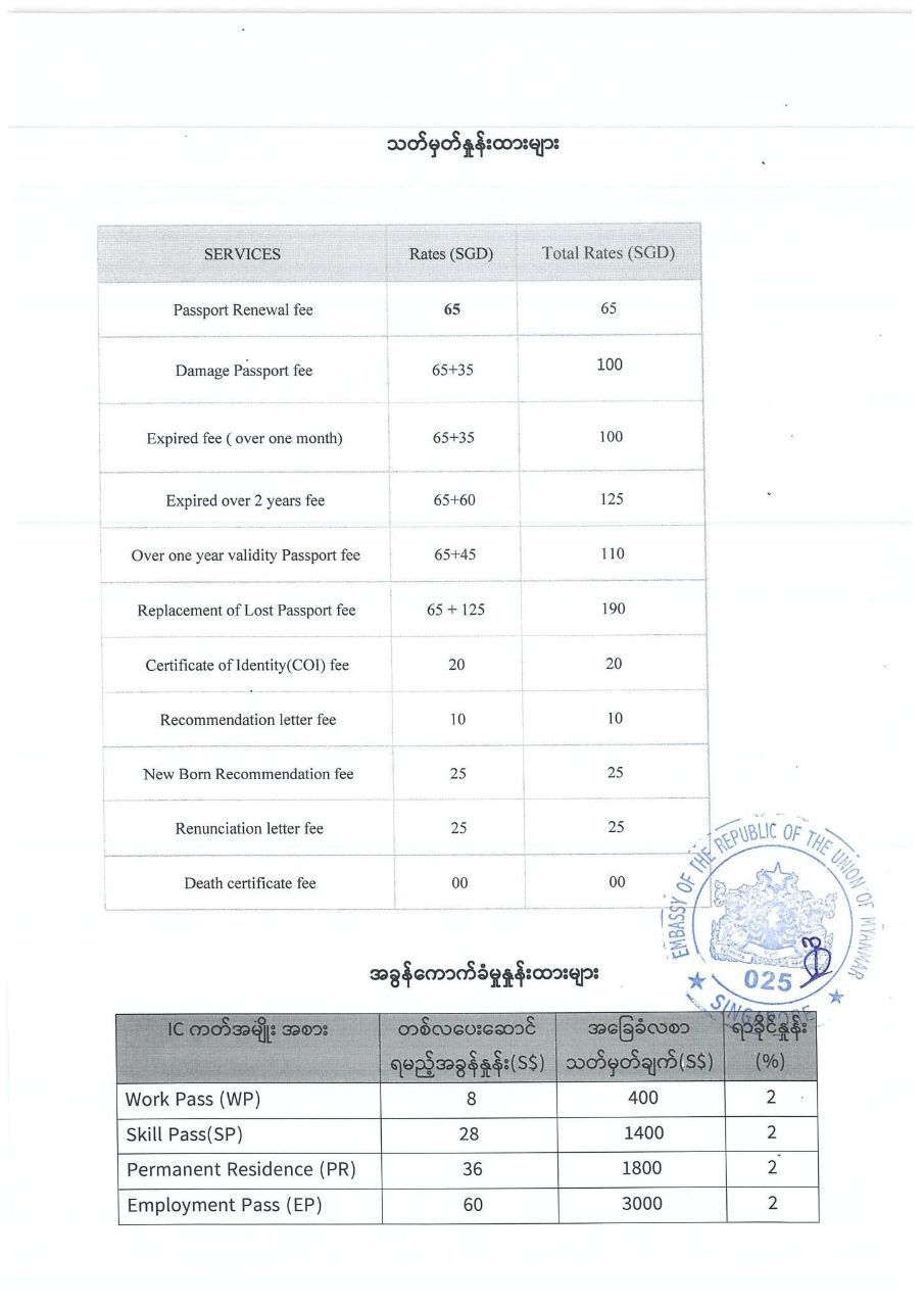 အလားတူ ႏိုင္ငံကူးလက္မွတ္သက္တမ္းတိုး လာေရာက္ရာတြင္ သတ္မွတ္ႏႈန္းထားမ်ားထက္ပိုမိုေကာက္ခံျခင္းမ်ားရွိပါက သံ႐ုံးဝင္းအတြင္းမွထြက္ခြာျခင္း မျပဳမီ သံ႐ုံးေကာင္စစ္အရာရွိ သို႔မဟုတ္ သံ႐ုံးတာဝန္ခံအရာရွိမ်ားထံသို႔ ခ်က္ခ်င္းတိုင္ၾကားရန္ႏွင့္ သက္ေသအေထာက္အထားခိုင္မာစြာျပသႏိုင္ပါက ထိေရာက္စြာအေရးယူ ေဆာင္႐ြက္သြားမည္ျဖစ္ေၾကာင္း စင္ကာပူႏိုင္ငံဆိုင္ရာ ျမန္မာသံ႐ုံးက အသိေပးထုတ္ျပန္ထားသည္။