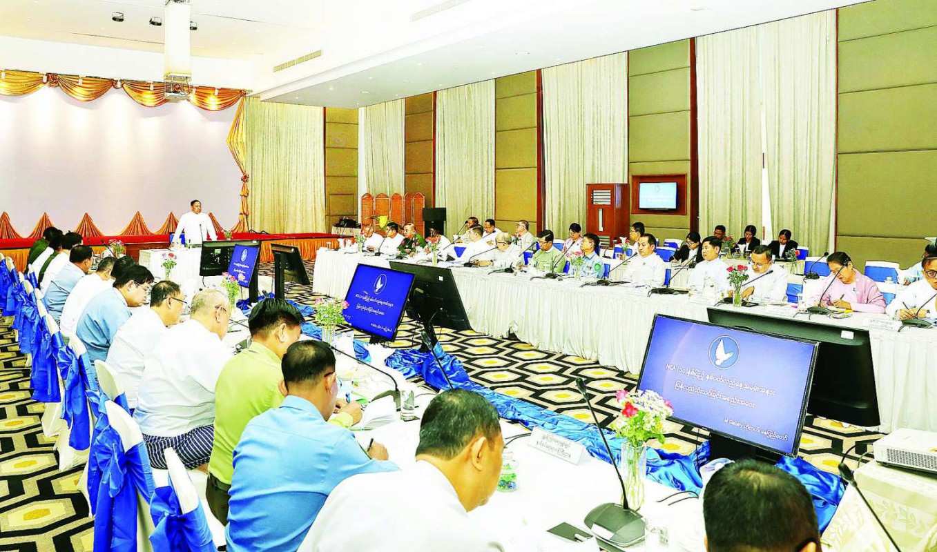 အစည္းအေဝးသို႔ NCA (၁၀)ႏွစ္ျပည့္ ႏွစ္ပတ္လည္ေန႔အခမ္းအနားက်င္းပေရး ဦးစီးေကာ္မတီဥကၠ႒ ျပည္ေထာင္စု ဝန္ႀကီး ဒုတိယဗိုလ္ခ်ဳပ္ႀကီးရာျပည့္၊ အမ်ိဳးသားစည္းလုံးညီၫြတ္ေရးႏွင့္ ၿငိမ္းခ်မ္းေရးေဖာ္ေဆာင္မႈညႇိႏႈိင္းေရး ေကာ္မတီအတြင္းေရးမႉး ဒုတိယဗိုလ္ခ်ဳပ္ႀကီး မင္းႏိုင္ႏွင့္ ေကာ္မတီဝင္မ်ား၊ ဦးစီးေကာ္မတီအဖြဲ႕ဝင္မ်ား ျဖစ္ၾက သည့္ ျပည္ေထာင္စုဝန္ႀကီးဌာနမ်ားမွဒုတိယဝန္ႀကီးမ်ားႏွင့္ တာဝန္ရွိသူမ်ား တက္ေရာက္ၾကသည္။