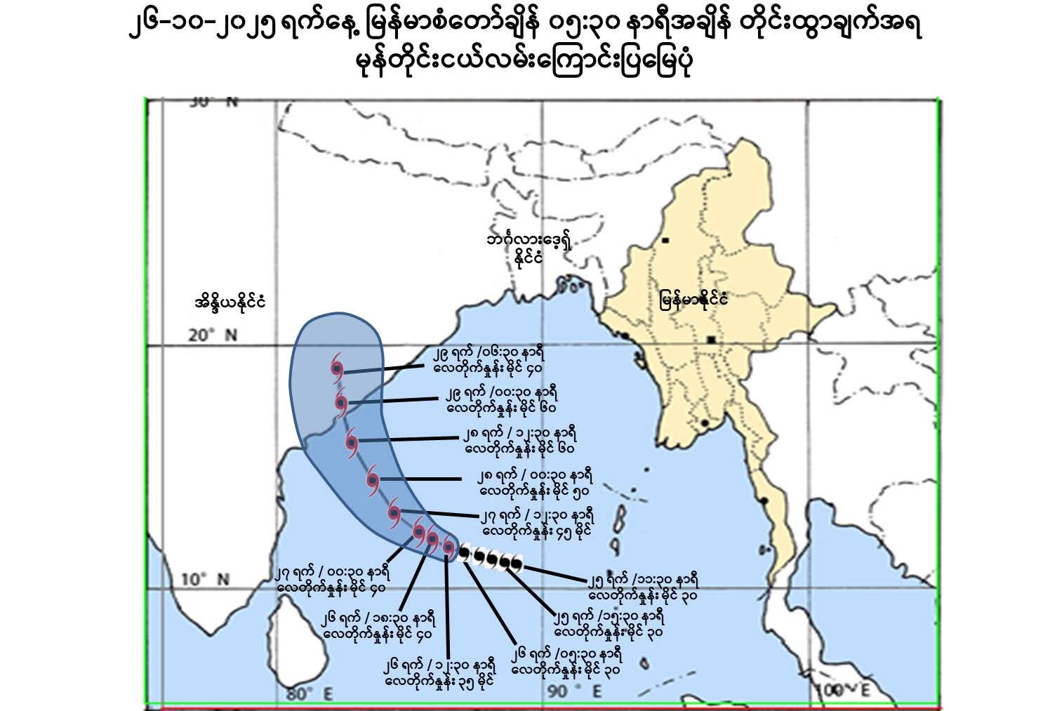 ဘင်္ဂလား ပင်လယ်အော်အရှေ့တောင်ပိုင်းတွင် ဖြစ်ပေါ်နေသော မုန်တိုင်းငယ် သည် မြန်မာနိုင်ငံသို့ မဝင်ရောက်နိုင်သော်လည်း မိုးရွာသွန်းခြင်းများဖြစ်ပေါ်နိုင်ကြောင်း မိုးလေဝသနှင့်ဇလဗေဒညွှန်ကြားမှုဦးစီးဌာနက ယနေ့ (အောက်တိုဘာ ၂၆ရက်)တွင် အသိပေးထုတ်ပြန်ထားခြင်းဖြစ်သည်။