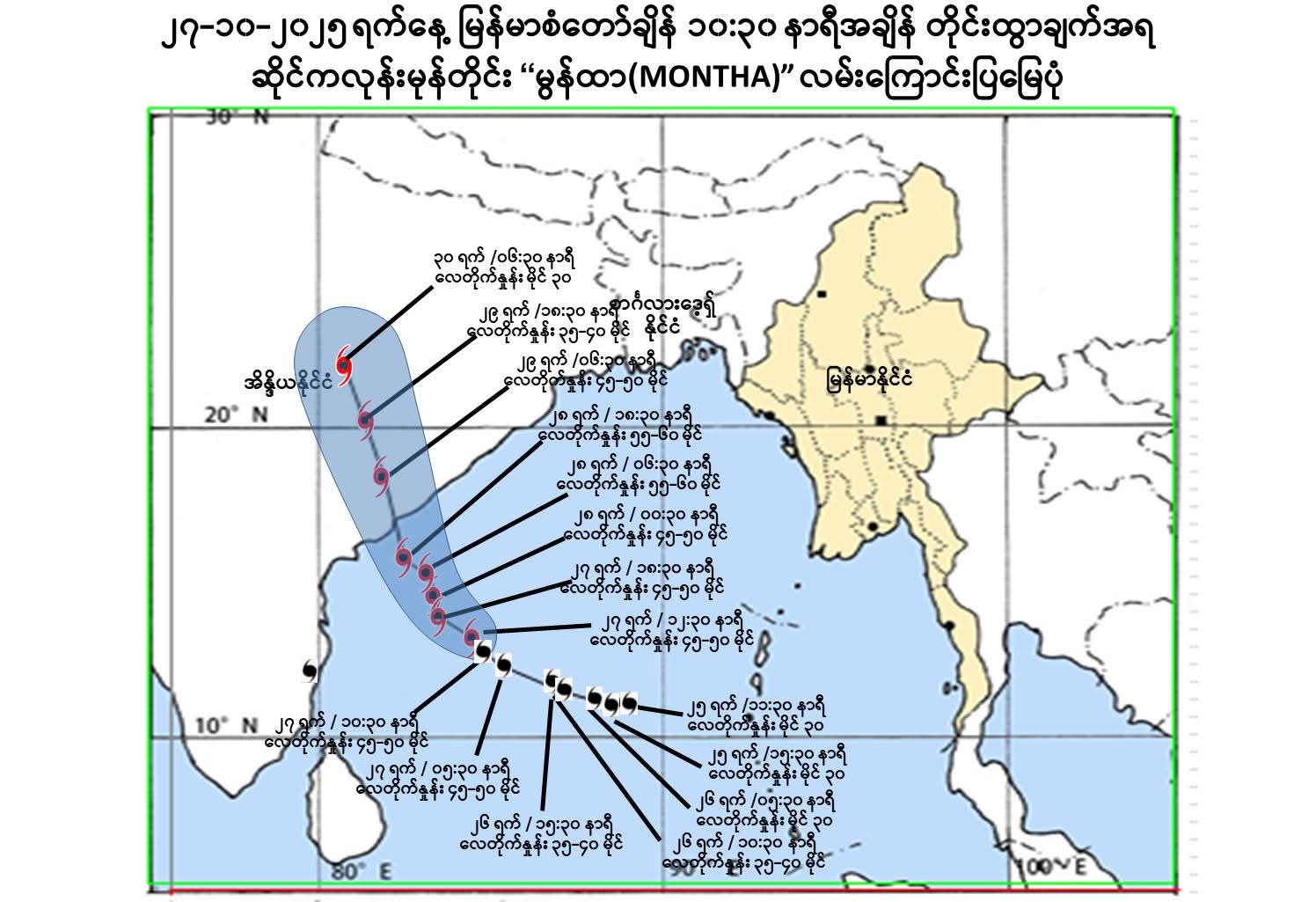 မိုးဇလ၏ တိုင္းထြာခ်က္အရ ဘဂၤလား ပင္လယ္ေအာ္အေနာက္ေတာင္ပိုင္းတြင္ ျဖစ္ေပၚေနေသာ ဆိုင္ကလုန္းမုန္တိုင္း “မြန္ထာ” သည္ ေျမာက္-အေနာက္ေျမာက္ဘက္သို႔ ေ႐ြ႕လ်ားခဲ့ၿပီး ဘဂၤလားပင္လယ္ေအာ္အေနာက္ေတာင္ပိုင္းႏွင့္ ယင္းႏွင့္ဆက္စပ္လ်က္ရွိေသာ ဘဂၤလားပင္လယ္ေအာ္အေနာက္အလယ္ပိုင္းသို႔ ေရာက္ရွိခဲ့ေၾကာင္း သိရသည္။