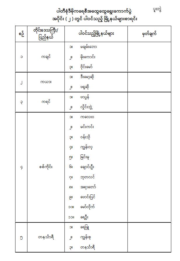 အထွေထွေရွေးကောက်ပွဲ့အပိုင်း (၂) တွင် ချင်းပြည်နယ်မှ မြို့နယ်အချို့နှင့် ရခိုင်ပြည်မှ မြို့နယ်အချို့ မပါဝင်သေး ကြောင်း သိရသည်။