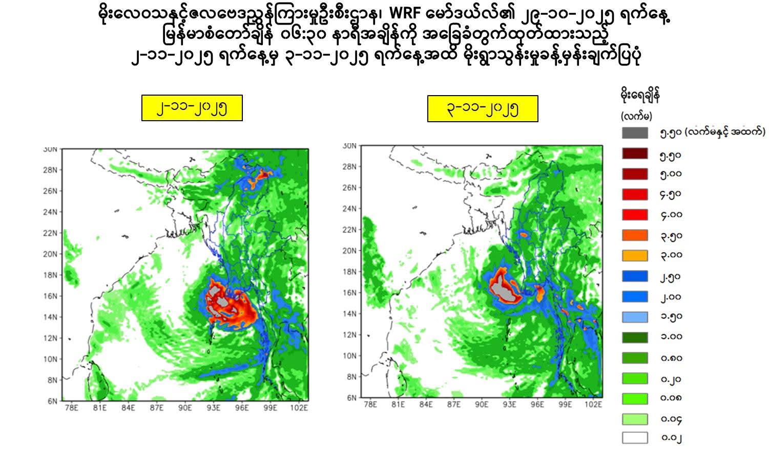 မိုးဇလ၏ တိုင္းထြာခ်က္မ်ားအရ အေရွ႕ဘက္မွ ေ႐ြ႕လ်ား လာေသာ ေလေပြလႈိင္းမ်ား၏ အရွိန္ေၾကာင့္လည္းေကာင္း ကပၸလီပင္လယ္ျပင္ႏွင့္ ဘဂၤလားပင္လယ္ေအာ္ တို႔တြင္ ေလထုမၿငိမ္မသက္မႈမ်ား ျဖစ္ေပၚလာႏိုင္ျခင္းေၾကာင့္ ေအာက္တိုဘာ ၃၁ရက္မွ ႏိုဝင္ဘာ၅)ရက္ေန႔အတြင္း စစ္ကိုင္းတိုင္းေဒသႀကီး၊ မေကြးတိုင္းေဒသႀကီး၊ ကခ်င္ျပည္နယ္ႏွင့္ ရွမ္းျပည္နယ္(ေျမာက္ပိုင္း)တို႔တြင္ ေနရာက်ဲက်ဲ မိုး႐ြာႏိုင္ေၾကာင္း သိရသည္။