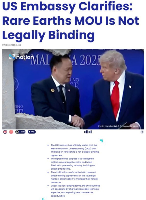 ယနေ့ နေးရှင်းရဲ့ အခြားသတင်းမှာတော့ ထိုင်းနဲ့ ဝါရှင်တန်အကြား မြေရှားဆိုင်ရာ MoU မှာ မဖြစ်မနေ ဆောင် ရွက်ရမယ်လို့ စည်းနှောင်ထားချက် မပါဝင်ကြောင်း၊ အရေးကြီး သတ္တုထောက်ပံ့ရေးကွင်းဆက်များ ခိုင်မာစေ ရန်နဲ့ ထိုင်းနိုင်ငံရဲ့ မြေရှား ပြုပြင်ထုတ်လုပ်မှု- ရင်းနှီးမြှုပ်နှံမှုကို အဆင့်မြှင့်တင်ရန်သာဖြစ်ပြီး နိုင်ငံတစ်နိုင်ငံရဲ့ အချုပ်အခြာအာဏာပိုင်မှုကို ထိခိုက်ခြင်း မရှိကြောင်း ဘန်ကောက် အမေရိကန်သံရုံးက တရားဝင် သတင်း ထုတ်ပြန်တယ်လို့ ရေးပါတယ်။