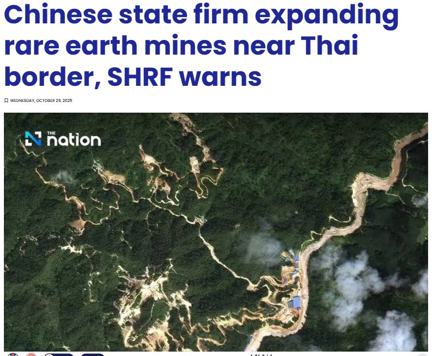 တရုတ်နိုင်ငံပိုင်ကုမ္ပဏီတစ်ခုဖြစ်တဲ့ “ချိုင်းနား သတ္ထုတွင်း ရင်းနှီးမြှုပ်နှံမှု ကုမ္ပဏီ” ရဲ့ ရွှေနဲ့ မြေရှားသတ္တုတူး ဖော်ရေးလုပ်ငန်း ချဲ့ထွင်မှုဟာ မြန်မာနိုင်ငံ ရှမ်းပြည်နယ်အရှေ့ပိုင်း မိုင်းဆတ်မြို့နယ်တောင်ဘက် မိုင်းယောင်း မြို့ “နမ့်ယောင်းချောင်း” အနီးအထိ လျင်မြန်စွာတိုးချဲ့လာကြောင်း၊ ၂၀၂၅ ခုနှစ် အောက်တိုဘာလ ၁၄ ရက်နေ့ ရိုက်ကူးခဲ့တဲ့ ဂြိုဟ်တုဓါတ်ပုံများအရ ထိုင်းနိုင်ငံ၊ ချင်းမိုင်မြို့ သာတုန်ရွာမှ ၁၉-မိုင်ခန့်သာ ကွာဝေးတဲ့ ချောင်းအ နီး အသစ်ဖောက်လုပ်ထားတဲ့ လမ်းများ၊ သတ္တုတူးဖော်ရေး ဧရိယာကြီးများနဲ့ သန့်စင်ရေးလုပ်ငန်းခွင်များကို တွေ့မြင်ရကြောင်း ရှမ်းလူ့အခွင့်အရေးဖောင်ဒေးရှင်း (SHRF) က ပြောပြတယ်လို့ ဘန်ကောက်အေ ခြေစိုက် “နေးရှင်း” သတင်းစာ (29 October 2025) က ရေးပါတယ်။