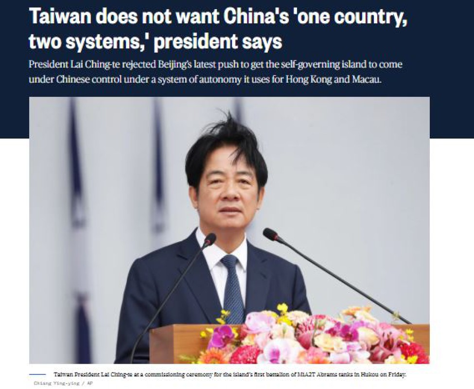 တရုတ်(တိုင်ပေ) အနေဖြင့် တရုတ်နိုင်ငံ၏တစ်နိုင်ငံတည်း စနစ်နှစ်မျိုးဆိုသော မူဝါဒကို လက်ခံမည်မဟုတ် ကြောင်း၊ တရုတ်နိုင်ငံက တရုတ်တိုင်ပေကို ကိုယ်ပိုင်အုပ်ချုပ်ခွင့်ပေးရန်ကမ်းလှမ်းထားကြောင်း တရုတ်တိုင်ပေသမ္မတ လိုင်ချန် တေးကထုတ်ဖော်ပြောဆိုလိုက်သည်။