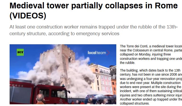 အီတလီႏိုင္ငံ ေရာမၿမိဳ႕လယ္ရွိ သမိုင္းဝင္အထိမ္းအမွတ္ေနရာ Colosseum အနီးမွာတည္ရွိတဲ့ အလယ္ေခတ္ ေမွ်ာ္စင္ Torre dei Conti ဟာ တစ္စိတ္တစ္ပိုင္းၿပိဳက်ခဲ့ၿပီး ေဆာက္လုပ္ေရးလုပ္သား(၃)ဦး ထိခိုက္ဒဏ္ရာရရွိခဲ့ၿပီး တစ္ဦးက အပ်က္အစီးေတြေအာက္မွာ ပိတ္မိေနခဲ့တယ္လို႔ သိရပါတယ္။