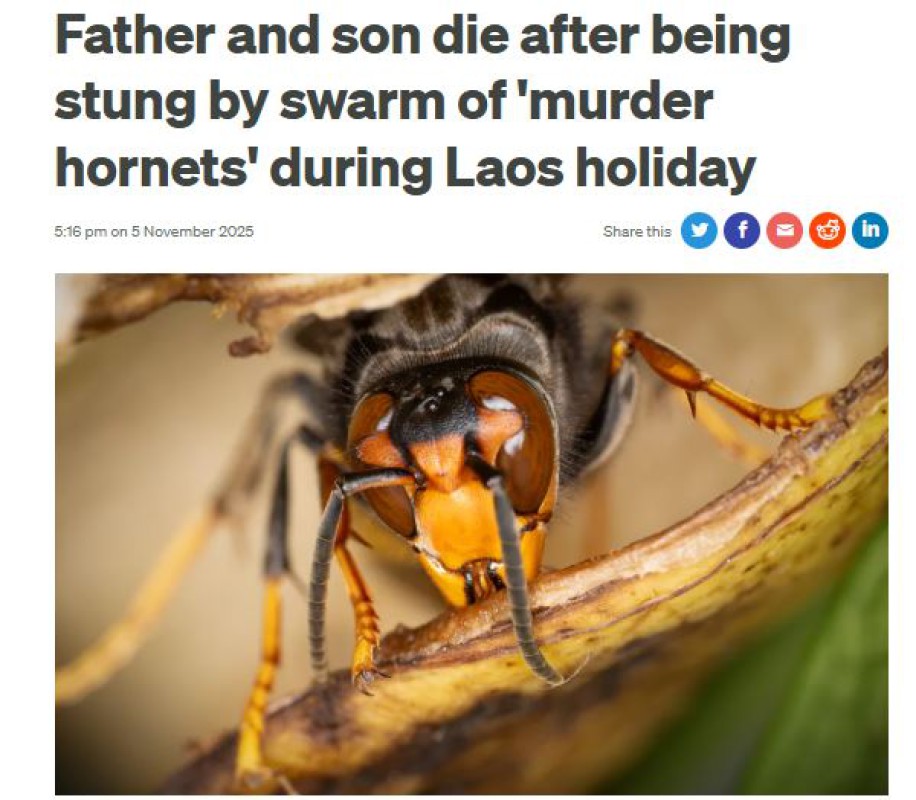 လာအိုမိုင်ငံမှာ အပန်းဖြေ အနားယူနေတဲ့ အမေရိကန်အမျိုးသားတစ်ဦးနဲ့ သူ့ရဲ့ ဆယ်ကျော်သက်အရွယ် သားဖြစ်သူဟာ တောထဲမှာ ဧရာမပျားတုပ်ခံရပြီး သေဆုံးသွားခဲ့ပါတယ်။
