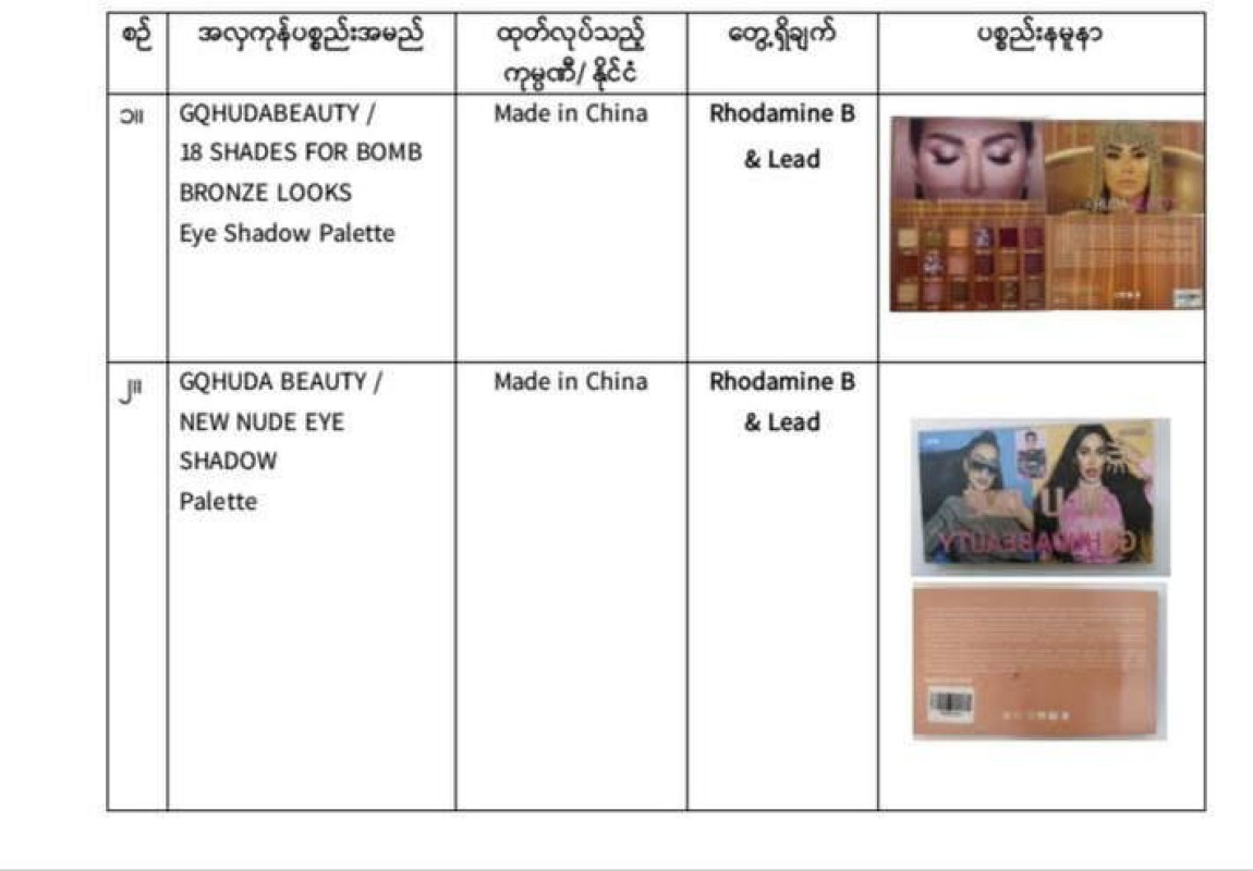 အဆိုပါ အလွကုန္ပစၥည္းမ်ားမွာ (၁) GQHUDABEAUTY/ 18 SHADES FOR BOMB BRONZE LOOKS Eye Shadow Palette (Made in China ) (Rhodamine B & Lead)၊ (၂) GQHUDA BEAUTY / NEW NUDE EYE SHADOW Palette ( Made in China) (Rhodamine B & Lead) ၊ (၃) Karite / Velvet Cheer 3 in 1 Blusher & Highlighter Powder & Contour (Made in China) (Rhodamine B)၊ (၄) NYX / POWDER PUFF LIPPIE PPL01 COOL INTENTIONS( Made in Taiwan) (Rhodamine B) ႏွင့္ (၅) ANYLADY / MAKE UP PALETTE (STRAWBERRY JOY) (Made in P.R.C) (Rhodamine B & Lead) တို႔ ျဖစ္ေၾကာင္း သိရသည္။