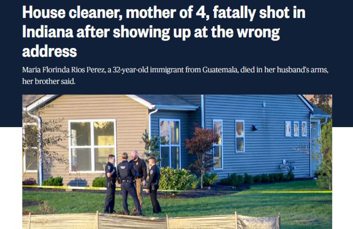 အမေရိကန်နိုင်ငံ၊ အင်ဒီယားနားပြည်နယ်မှာ ဗုဒ္ဓဟူးနေ့(နိုဝင်ဘာ ၅ ရက်) က အိမ်သန့်ရှင်းရေး အမျိုးသမီး တစ်ဦးဟာ အိမ်မှားဝင်မိလို့ သေနတ်နဲ့ ပစ်သတ်ခံလိုက်ရပါတယ်။