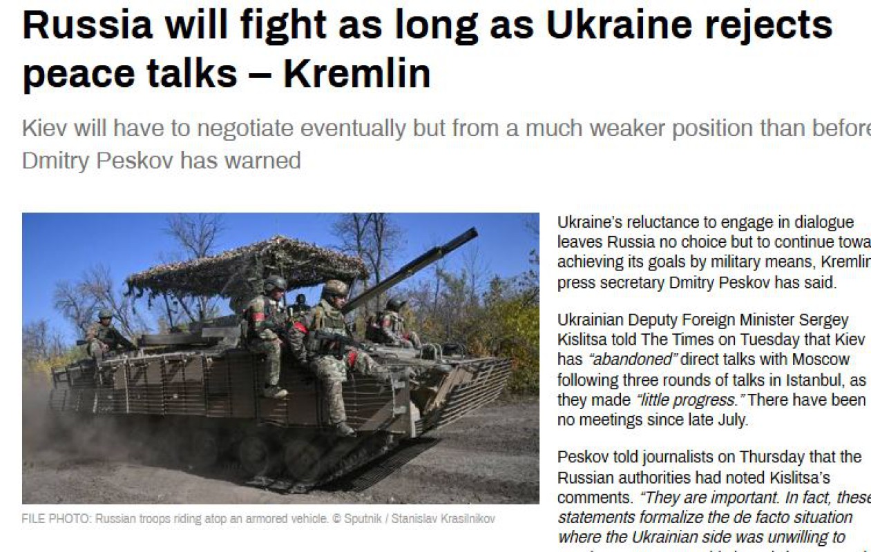ယူကရိန်းနိုင်ငံက အပစ်ခတ်ရပ်စဲရေးငြိမ်းချမ်းရေးကို ငြင်းဆန်ပယ်ချနေသည့်ကာလပတ်လုံး ရုရှားနိုင်ငံအနေဖြင့် ယူကရိန်းနိုင်ငံကို ဆက်လက်တိုက်ခိုက်သွားမည်ဖြစ်ကြောင်း ရုရှားအစိုးရအဖွဲ့ပြောရေးဆိုခွင့်ရှိသူက ပြောသည်။ ယူကရိန်းနိုင်ံခြားရေးဝန်ကြီးဌာနဒုတိယဝန်ကြီးကစ်လစ်ဆာက ရုရှားအစိုးရအဖွဲ့တာဝန်ရှိသူများနှင့် တူရကီနိုင်ငံ တွင် သုံးကြိမ်မြောက် တွေ့ဆုံဆွေးနွေးမှုနောက် ရုရှားနှင့်တိုက်ရိုက်တွေ့ဆုံဆွေးနွေးမည်မဟုတ်ကြောင်း ထုတ်ဖော် ပြောဆိုခဲ့ပြီးနောက် ရုရှားအစိုးရအဖွဲ့ပြောရေးဆိုခွင့်ရှိသူ ပက်ကောဗ့်က ထုတ်ဖော်ပြောခဲ့ခြင်းဖြစ်သည်။