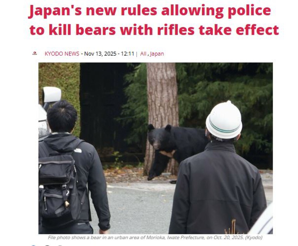 ဂျပန်နိုင်ငံမှာ ဝက်ဝံတိုက်ခိုက်ခံရမှုတွေ မြင့်တက်လာခြင်းကို တုံ့ပြန်တဲ့အနေနဲ့ ဂျပန်ရဲတပ်ဖွဲ့ဝင်တွေကို ရိုင်ဖယ်သေနတ်နဲ့ ဝက်ဝံတွေကို သတ်ဖြတ်ခွင့်ပြုခဲ့တဲ့ ဥပဒေသစ် နိုဝင်ဘာ ၁၃ ရက်က အသက်ဝင်ခဲ့ပါတယ်။