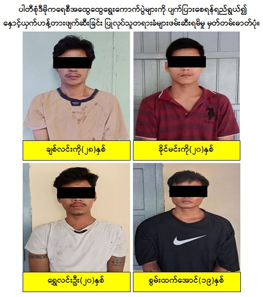 ထိုသို့ လွှတ်တော်ကိုယ်စားလှယ်လောင်းများအား ဥပဒေနှင့်အညီ မဲဆွယ်စည်းရုံးခြင်းမပြုနိုင်စေရန် စိုက်ထူထား သော ပါတီကိုယ်စားလှယ်လောင်းများ၏ ပါတီဆိုင်းဘုတ်များအားဖျက်ဆီးပြီး ခြိမ်းခြောက်ဟန့်တားခြင်းများ ပြုလုပ်ခဲ့သူ ချစ်လင်းကိုပါ (၄) ဦးအား သင်္ဃန်းကျွန်းမြို့မရဲစခန်းတွင် (ပ)၂၃၉/၂၀၂၅၊ ပါတီစုံဒီမိုကရေစီ အထွေထွေရွေးကောက်ပွဲများကို နှောင့်ယှက်ဟန့်တားဖျက်ဆီးခြင်းမှ ကာကွယ်ပေးရေးဥပဒေပုဒ်မ ၂၄(က) ဖြင့် အမှုဖွင့်ပြီး ထိရောက်သောပြစ်ဒဏ်ရရှိရေးအတွက် ဆောင်ရွက်လျက်ရှိကြောင်း ထုတ်ပြန်ချက်တွင် ဖော်ပြထားသည်။