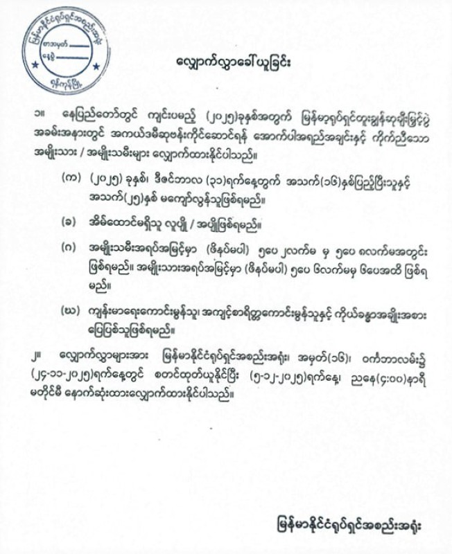 လျှောက်ထားသူသည် ယခုနှစ် ဒီဇင်ဘာလ (၃၁)ရက်အတွက် အသက်(၁၆)နှစ်ပြည့်ပြီးသူဖြစ်ရမည်ဖြစ်ပြီး အသက်(၂၅)နှစ် မကျော်လွန်သူလည်းဖြစ်ရမည့်အပြင် လူပျို၊ အပျိုဖြစ်ရမည်ဖြစ်ကြောင်း သိရသည်။