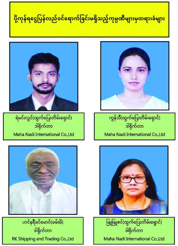 ျပည္ပသို႔ပို႔ကုန္မ်ားတင္ပို႔ခဲ့ၿပီး ပို႔ကုန္ရေငြျပန္လည္ ဝင္ေရာက္ျခင္းမရွိခဲ့သည့္ ကုမၸဏီမ်ားမွ တာဝန္ရွိသူမ်ားျဖစ္သည့္ ဦးရဲမင္းလြင္ (ထြက္ေျပးတိမ္းေရွာင္)၊ ေဒၚကြန္သီ (ထြက္ေျပးတိမ္းေရွာင္) ၊ ေဒၚျဖဴျဖဴဇင္ (ထြက္ေျပးတိမ္းေရွာင္)၊ ေဒၚျမင့္ျမင့္လႈိင္ (ဖမ္းမိ)၊ ေဒၚခင္စန္းသီ (ဖမ္းမိ)၊ ဦးဟင္နရီခင္ေမာင္ (ဖမ္းမိ)၊ ဦးဗိုဗိုသန႔္ (ဖမ္းမိ) ႏွင့္ ဦးေဌးကို (ထြက္ေျပးတိမ္းေရွာင္) တို႔ ရွစ္ဦးႏွင့္ အသင္းမွ တာဝန္ရွိသူမ်ားကို ႐ုန႔္ရင္းၾကမ္းတမ္းစြာ ဆဲဆိုျခင္း၊ အသက္အႏၲရာယ္ၿခိမ္းေျခာက္ျခင္းမ်ား ေဆာင္႐ြက္ခဲ့သူ ဦးရဲမင္းလြင္ (ထြက္ေျပးတိမ္းေရွာင္) တို႔အေပၚ ၎တို႔က်ဴးလြန္ခဲ့သည့္ ျပစ္မႈမ်ားအလိုက္ ထိေရာက္စြာအေရးယူသြားမည္ျဖစ္ေၾကာင္း သိရသည္။