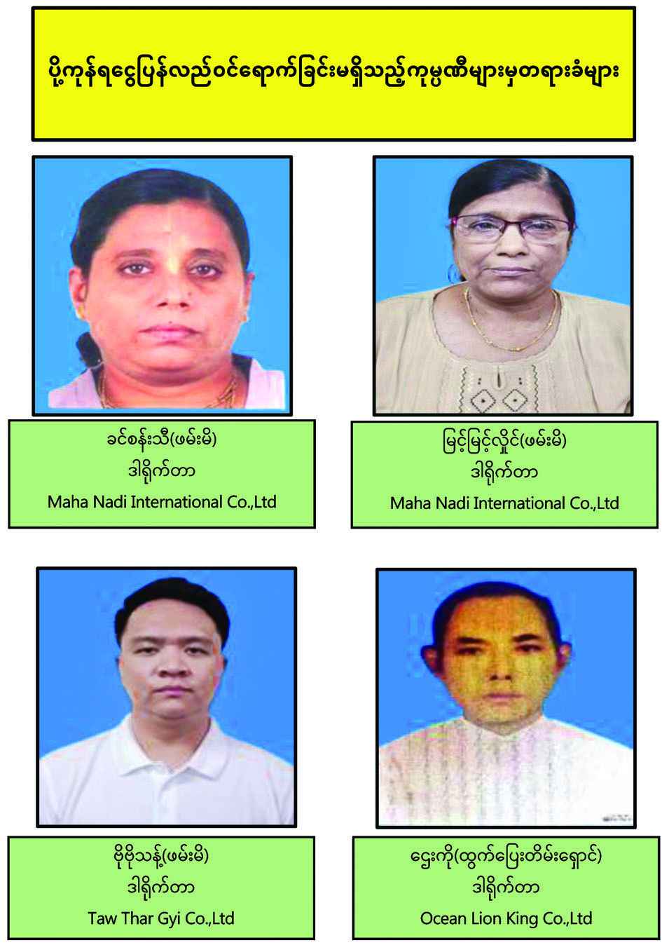 ပြည်ပသို့ပို့ကုန်များတင်ပို့ခဲ့ပြီး ပို့ကုန်ရငွေပြန်လည် ဝင်ရောက်ခြင်းမရှိခဲ့သည့် ကုမ္ပဏီများမှ တာဝန်ရှိသူများဖြစ်သည့် ဦးရဲမင်းလွင် (ထွက်ပြေးတိမ်းရှောင်)၊ ဒေါ်ကွန်သီ (ထွက်ပြေးတိမ်းရှောင်) ၊ ဒေါ်ဖြူဖြူဇင် (ထွက်ပြေးတိမ်းရှောင်)၊ ဒေါ်မြင့်မြင့်လှိုင် (ဖမ်းမိ)၊ ဒေါ်ခင်စန်းသီ (ဖမ်းမိ)၊ ဦးဟင်နရီခင်မောင် (ဖမ်းမိ)၊ ဦးဗိုဗိုသန့် (ဖမ်းမိ) နှင့် ဦးဌေးကို (ထွက်ပြေးတိမ်းရှောင်) တို့ ရှစ်ဦးနှင့် အသင်းမှ တာဝန်ရှိသူများကို ရုန့်ရင်းကြမ်းတမ်းစွာ ဆဲဆိုခြင်း၊ အသက်အန္တရာယ်ခြိမ်းခြောက်ခြင်းများ ဆောင်ရွက်ခဲ့သူ ဦးရဲမင်းလွင် (ထွက်ပြေးတိမ်းရှောင်) တို့အပေါ် ၎င်းတို့ကျူးလွန်ခဲ့သည့် ပြစ်မှုများအလိုက် ထိရောက်စွာအရေးယူသွားမည်ဖြစ်ကြောင်း သိရသည်။