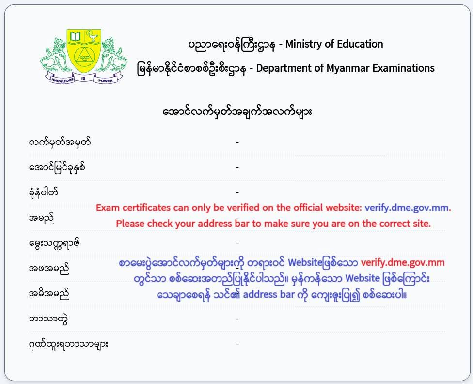 ထို႔ေၾကာင့္ တကၠသိုလ္ဝင္စာေမးပြဲ ေအာင္လက္မွတ္ပါ QR Code သည္ verify.dme.gov.mm သို႔ခ်ိတ္ဆက္၍ အခ်က္အလက္မ်ားစစ္ေဆးအတည္ျပဳႏိုင္မွသာ ျမန္မာႏိုင္ငံစာစစ္ဦးစီးဌာနမွ ထုတ္ေပးသည့္ ေအာင္လက္မွတ္အစစ္ျဖစ္ေၾကာင္း ေဖာ္ျပခ်က္အရ သိရသည္။