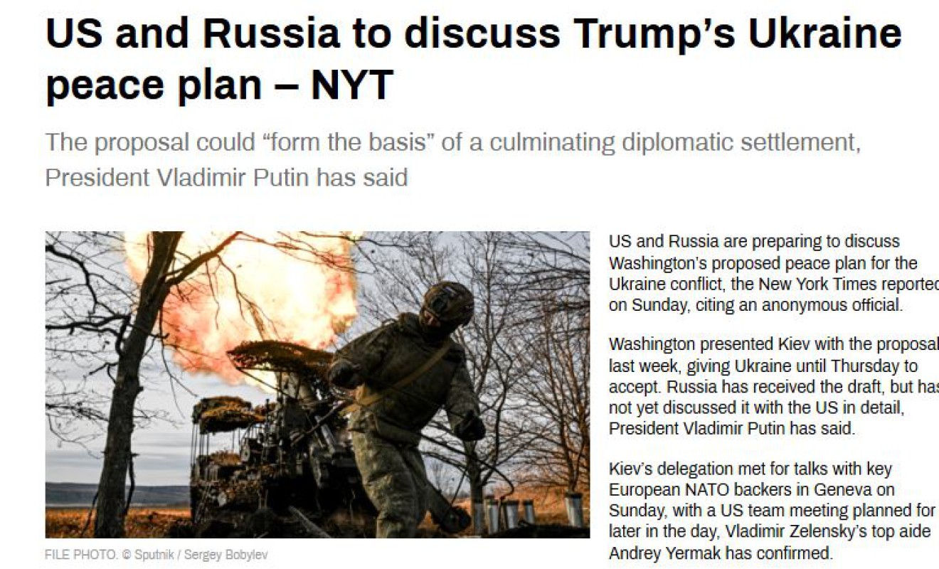 အမေရိကန်က အဆိုပြုထားတဲ့ ငြိမ်းချမ်းရေးသဘောတူညီချက်နဲ့ပတ်သက်ပြီး ယူကရိန်းကိုယ်စားလှယ်အဖွဲ့ဟာ အဓိက ဥရောပကျောထောက်နောက်ခံနိုင်ငံတွေနဲ့ တွေ့ဆုံဆွေးနွေးမှုတွေကို လုပ်ဆောင်ခဲ့တယ်လို့လည်း သိရပါတယ်။ ဒါ့ပြင် ယူကရိန်းသမ္မတဇီလန်စကီးက ငြိမ်းချမ်းရေးသဘောတူညီချက်ကို လက်ခံပါက အမေရိကန် အထူးသံတမန် စတိဗ်ဝစ်အော့ဖ်ဟာ ငြိမ်းချမ်းရေးအစီအစဉ်ကို ရုရှားသမ္မတပူတင်ကို တင်ပြနိုင်ဖွယ်ရှိနေတယ်လို့ လည်း အမည်မဖော်လိုတဲ့အရာရှိရဲ့ပြောကြားချက်ကို ကိုးကားပြီး NYT က ရေးသားဖော်ပြခဲ့ပါတယ်။