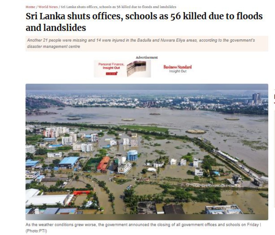 သီရိလင်္ကာနိုင်ငံမှာ ရေကြီးမှုနဲ့မြေပြိုမှုတွေကြောင့် သေဆုံးသူအရေအတွက် (၅၆)ဦးအထိ မြင့်တက်လာ