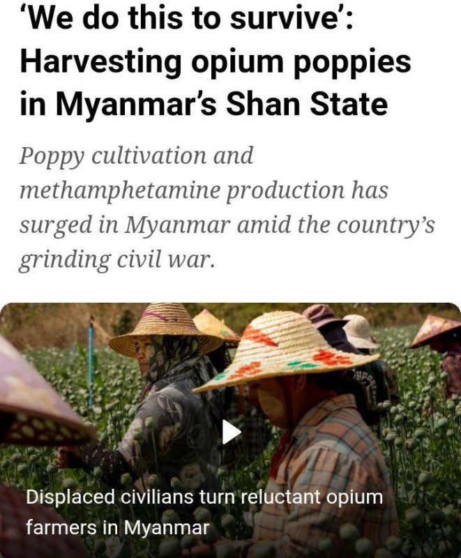 စစ္ေဘးသင့္ ျမန္မာႏိုင္ငံရဲ႕ ဘိန္းစိုက္ပ်ိဳးမႈဟာ ၁၀ ႏွစ္အတြင္း အျမင့္ဆုံးအဆင့္သို႔ ေရာက္ရွိလာခဲ့ေၾကာင္း ကုလသမဂၢ မူးယစ္ေဆးဝါးနဲ႔ ရာဇဝတ္မႈဆိုင္ရာ႐ုံး (UNODC) ရဲ႕ ယခုေနာက္ဆုံး အစီရင္ခံစာမွာ ေဖာ္ျပ ထားတယ္လို႔ “အယ္လ္ဂ်ားဇီးယား” (3 December 2025) က ေရးပါတယ္။