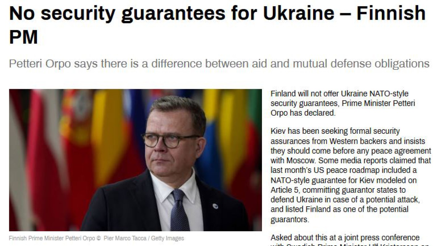 ဖင္လန္ႏိုင္ငံက ယူကရိန္းကို ေနတိုးပုံစံလုံၿခဳံေရးအာမခံခ်က္မ်ားေပးမည္ မဟုတ္ေၾကာင္း ဖင္လန္ဝန္ႀကီးခ်ဳပ္ ပက္တီရီေအာ္ပိုက ထုတ္ျပန္ေၾကညာခဲ့သည္။ ယူကရန္းအစိုးရက ၎၏အေနာက္အုပ္စု ေက်ာေထာက္ေနာက္ခံ ႏိုင္ငံမ်ားထံမွ လုံၿခဳံေရးအာမခံခ်က္မ်ား ရရွိရန္ ႀကိဳးပမ္းေနသည့္အခ်ိန္တြင္ ပက္တီရီေအာ္ပိုက ယခုကဲ့သို႔ ထုတ္ျပန္ေျပာဆိုခဲ့ျခင္းျဖစ္သည္။