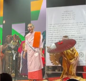 ထိုင်း-လိင်ပြောင်းအမျိုးသမီးအလှမယ်တစ်ဦးက မြန်မာနိုင်ငံကိုယ်စားပြုအဖြစ် ဝင်ရောက်ယှဉ်ပြိုင်ခဲ့ခြင်းဖြစ်ပြီး ပသေနဒိကောသလမင်းကြီးရဲ့မိဖုရားကြီး မလ္လိကာဝတ်ဆင်ခဲ့တဲ့ (မဟာလတာတန်ဆာ) ကို ဝတ်ဆင်ကာ ဗုဒ္ဓဘာသာ ဝင်တိုင်း အထွတ်အမြတ်ထားရာ ယုံကြည်ကိုးကွယ်တဲ့ မြန်မာနိုင်ငံရှိ ရွှေတိဂုံစေတီတော်ပုံတူ Poster ကို နောက်ခံ ပြသကာ မဟာလတာတန်ဆာ ဝတ်စုံနဲ့တင်ဆက်ခဲ့ခြင်းဖြစ်ပြီး၊ အဲဒီနောက် အဆိုပါဝတ်စုံကိုချွတ်ကာ မယ်သီလရှင် ဝတ်စုံပြောင်းလဲသွားပြီး မြတ်စွာဘုရားရှင်ရဲ့ ‘ဓနသိဒ္ဓိ လာဘ်ရွှင်ဂါထာတော်’ကို နောက်ခံပြောင်းလဲ ပြသပြီး ဟာသ နှောအပြုအမူများထည့်သွင်းကာ တင်ဆက်ခဲ့ခြင်းဖြစ်ပါတယ်။