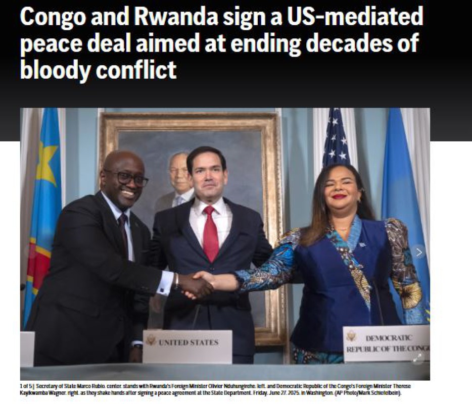 အမေရိကန်သမ္မတ ဒေါ်နယ်ထရမ့်သည် ရဝမ်ဒါနှင့်ကွန်ဂိုနိုင်ငံကြားဖြစ်ပွားနေသော ပဋိပက္ခ များကိုအဆုံး သတ်နိုင်ရန် ကြားဝင်စေ့စပ်ဆွေးနွေးခဲ့ပြီးနောက် ငြိမ်းချမ်းရေးစာချုပ်တွင် ပါဝင်လက်မှတ် ရေးထိုးခဲ့ကြောင်းသိရသည်။