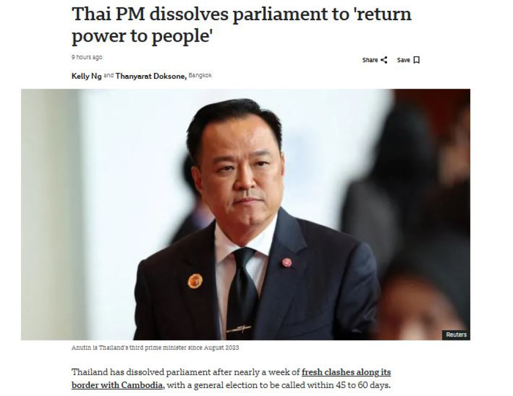 အနုတင် ဦးဆောင်သော ထိုင်းအစိုးရအဖွဲ့သည် ပြီးခဲ့သည့် သုံးလကျော်တွင် ထိုင်းနိုင်ငံကို တာဝန်ယူပြီးနောက် နိုင်ငံအခြေနေကိုတည်ငြိမ်ရန် ရုန်းကန်မှုများရှိနေသလို နယ်စပ်ဒေသအငြင်းပွားမှုများကို ရင်ဆိုင်နေရချိန်တွင် ထိုင်းလွှတ်တော်ကို ဖျက်သိမ်းလိုက်ခြင်းဖြစ်သည်။