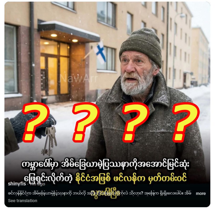 ဖင္လန္တစ္ႏိုင္ငံလုံး လူဦးေရ ၅.၆ သန္းသာရွိပါတယ္၊ သမၼတဦးသိန္းစိန္လက္ထက္ ရန္ကုန္တစ္ၿမိဳ႕တည္း ေလာက္ေတာင္ လူဦးေရေလာက္ေတာင္ မမ်ားတဲ့အျပင္ လူတစ္ဦးခ်င္း ဝင္ေငြ အျမင့္မားဆုံး ႏိုင္ငံ ၂၀ စာရင္း ဝင္ျဖစ္တဲ့အတြက္ အိမ္ေျခ ယာမဲ့ သိပ္အမ်ားႀကီး မရွိႏိုင္ပါဘူး။ အစိုးရအေနနဲ႔ ေပးႏိုင္တယ္၊