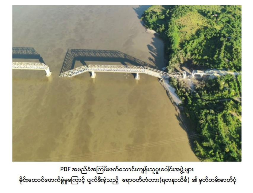 PDF အမည်ခံအကြမ်းဖက်သောင်းကျန်းသူပူးပေါင်းအဖွဲ့များအနေဖြင့် အဆိုပါဒေသအား ယာယီစိုးမိုးထားစဉ် မြို့/ရွာများအတွင်း ဘာသာရေးဆိုင်ရာအဆောက်အအုံများ၊ စာသင်ကျောင်းများ၊ ဌာနဆိုင်ရာအဆောက်အအုံများ၊ ဆေးရုံများနှင့် လူနေအိမ်များအတွင်း ဝင်ရောက်နေရာယူ၍ ဘန်ကာများပြုလုပ်ခြင်း၊ ပြည်သူများ၏ အိုးအိမ်များကို ခံစစ်တံတိုင်းအဖြစ် အကာကွယ်ရယူ၍ ပစ်ခတ်တိုက်ခိုက်ခြင်း၊ ပြည်သူများ အဓိကသွားလာအသုံးပြုလျက်ရှိသည့် လမ်း/တံတားများအား မိုင်းထောင်ဖောက်ခွဲခြင်းများ ဆောင်ရွက်လျက်ရှိရာ အောက်တိုဘာလ ၂၉ ရက်တွင်လည်း မန္တလေးတိုင်းဒေသကြီး၊ စဥ့်ကူးမြို့နှင့် စစ်ကိုင်းတိုင်းဒေသကြီး၊ ကျောက်မြောင်းမြို့ကို ဆက်သွယ်ထား၍ ပြည်သူလူထု၏ လမ်းပန်းဆက်သွယ်ရေးနှင့် ကုန်စည်စီးဆင်းမှုတို့အတွက် အဓိကအရေးပါသည့် ဧရာဝတီတံတား (ရတနာသိင်္ခ)ကိုလည်း မိုင်းထောင် ဖောက်ခွဲဖျက်ဆီးခဲ့သဖြင့် တံတား၏ ရေလည်တိုင်များဖြစ်သည့် တိုင်အမှတ် RP4 နှင့် RP5 တို့အကြားတွင် လည်းကောင်း၊ RP6-A2 ချဉ်းကပ်လမ်းနေရာတို့တွင်လည်း ကောင်းကျိုးကျ ပျက်စီးခဲ့သဖြင့် မော်တော်ယာဉ်များနှင့် ခရီးသွားပြည်သူများဖြတ်သန်းသွားလာနိုင်ခြင်း မရှိတော့ဘဲ ကုန်စည် စီးဆင်းမှုများ ရပ်တန့်ခဲ့ရကြောင်း သိရသည်။
