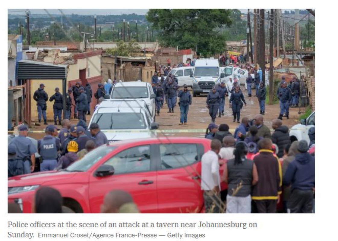 ေတာင္အာဖရိကႏိုင္ငံ ဂ်ိဳဟန္နက္စ္ဘာ့ခ်္ၿမိဳ႕ အေနာက္ေတာင္ဘက္မွာရွိတဲ့ ၿမိဳ႕တစ္ၿမိဳ႕မွာ ပစ္ခတ္မႈတစ္ခုျဖစ္ပြား ခဲ့ရာ အနည္းဆုံးလူ(၉)ဦးေသဆုံးၿပီး အျခားလူ(၁ဝ)ဦး ထိခိုက္ဒဏ္ရာရရွိခဲ့တယ္လို႔ အာဏာပိုင္ေတြက ထုတ္ျပန္ ေျပာၾကားခဲ့ပါတယ္။ အဲဒီတိုက္ခိုက္မႈနဲ႔ပတ္သက္ၿပီး သံသယရွိသူေတြကို အာဏာပိုင္ေတြက ခ်က္ခ်င္းလိုက္လံ ဖမ္းဆီးေနတယ္လို႔လည္း ေတာင္အာဖရိကရဲတပ္ဖြဲ႕က ေျပာၾကားခဲ့ပါတယ္။