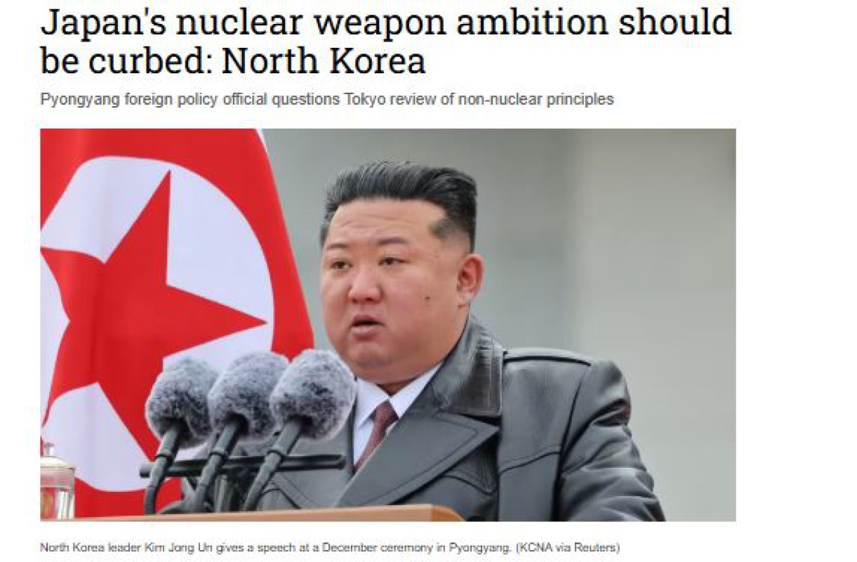 ဂျပန်နိုင်ငံက နျူကလီးယားလက်နက်တွေပိုင်ဆိုင်သင့်တယ်လို့ ဂျပန်အရာရှိတစ်ဦးက အကြံပြုပြောဆိုခဲ့ပြီးနောက် မြောက်ကိုရီးယားအစိုးရရဲ့ပြောဆိုချက်တွေ ထွက်ပေါ်လာတာဖြစ်ပါတယ်။
